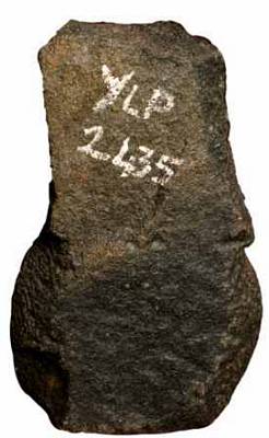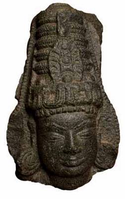 | Description / विवरण | Head of a deity. He wears a kiritimakuta with six tiers. There are long beaded chains on either side of the crown. There is a cresentic moon in the centre of crown on the front. He wears charka kundalas. He has short blunt nose with thick lips. He is shown with long pointed nose broken , diamond shaped eyes, thick eyebrows, thick lower lip and smiling face. |