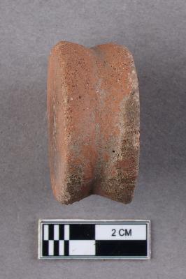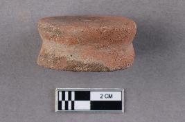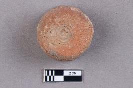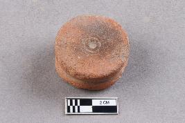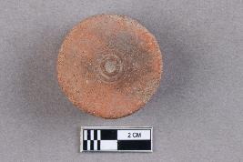 | Description / विवरण | A solid, short, double-flared cylinder of terracotta. This may have been used as an ear stud. There are concentric circles etched on both the flat surfaces as decoration. |