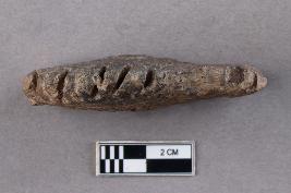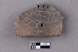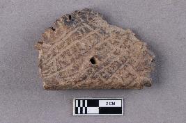 | Description / विवरण | A flat and somewhat circular broken disc of terracotta with serrations along the edges and a central perforation. There is a lattice pattern etched on one surface while random squiggles cover the other surface. The perforation and edge serrations are imperfect. |