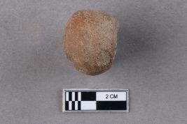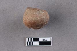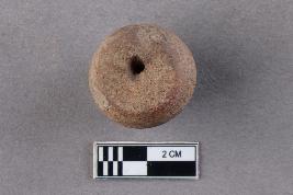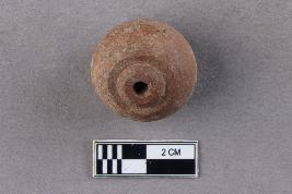 | Description / विवरण | A broken arecanut bead of terracotta. It is top-drilled and centrally perforated. The perforation towards the wider end is surrounded by a deep groove. It is reddish in colour. |