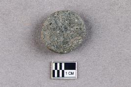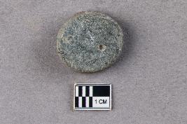 | Description / विवरण | Smooth disc-like hopscotch of stone. The stone is phaneritic in nature, but the surface is polished. A hole is seen on one surface. It is greenish grey in colour. |
