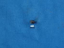 | Description / विवरण | A cylindrical shaped bead of jasper in black colour with a perforation at the center and a smooth surface. |