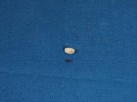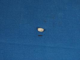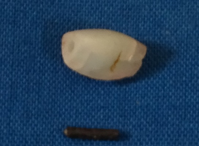 A barrel shaped bead of milky quartz with a triangular cross-section and perforation at the center.