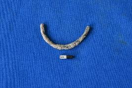 | Description / विवरण | A bangle fragment of copper with a circular cross-section and a patinated surface. |