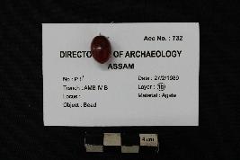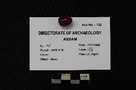 | Description / विवरण | This is an oval-shaped translucent bead of berry red color and vitreous luster. It is perforated at the center along the length to facilitate stringing. |