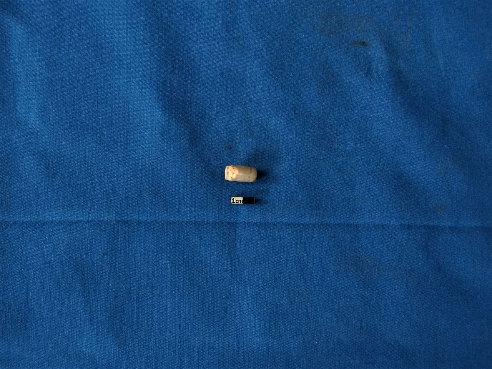 Cylindrical shaped bead of banded agate with breakage at one side corner. The bead is grey on the surface but is orangish in its section.