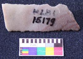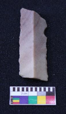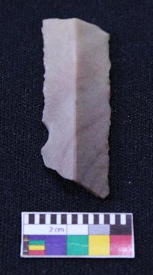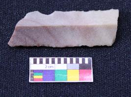 | Description / विवरण | Blade is partly reddish in color, made of fine-grained stone, having both ends broken, smooth body, retouched parallel sides, mid ridge and triangular section. |