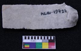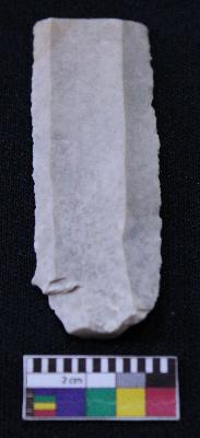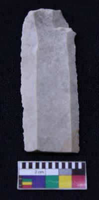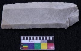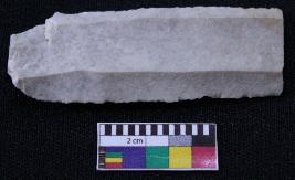| Description / विवरण | Blade is white in color, made of fine-grained stone, having positive bulb of percussion on one end and other end is broken, smooth body, retouched parallel sides and thin section. |