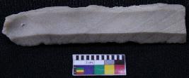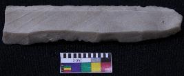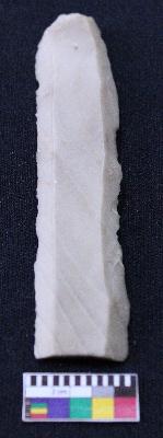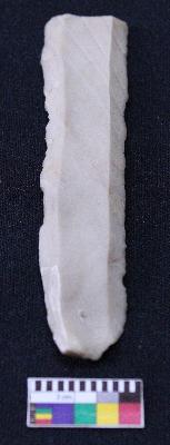 | Description / विवरण | Blade is off-white in color, made of fine-grained stone with band are present, having positive bulb of percussion on one end and other end is broken, smooth body, retouched parallel sides and two ridges on top. |