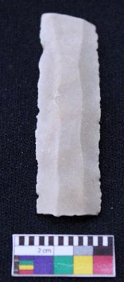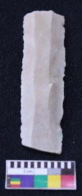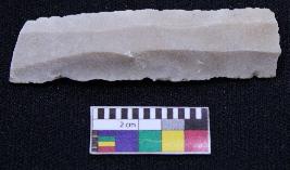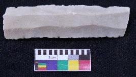 | Description / विवरण | Blade is whitish in color, made of fine-grained stone, having broken ends, smooth body, retouched parallel sides and two ridges on top. |
