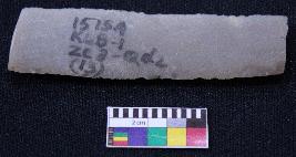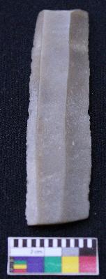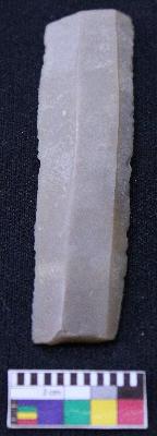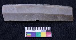 | Description / विवरण | Blade is light brown in color, made of fine-grained stone, having both ends broken, smooth body, retouched parallel sides, and two ridges. |