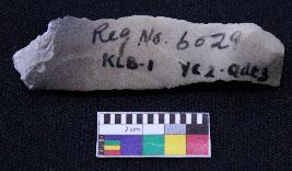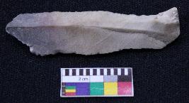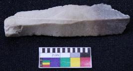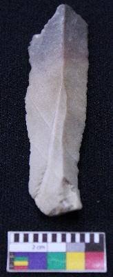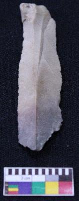 | Description / विवरण | Fragment of blade is partly black and off white in color, made of fine-grained stone, having positive bulb of percussion on one end and other end is broken, smooth body, retouched sides, mid ridges and triangular section. |