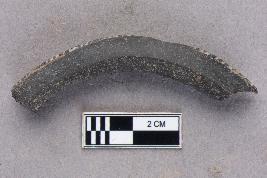 | Description / विवरण | An opaque, smooth glass bangle fragment that is black in colour. The cross-section appears to be triangular as a decorative band of black and white runs along the middle of the exterior surface of the bangle. |