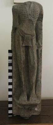 | Description / विवरण | This is an unknown image of a male figure in standing posture against a plain back ground. The right hand is placed on its backside while the left hand is holding a spear. The exposed ribs and sunken belly are portrayed nicely. The figures head is broken and missing. The private part of the figure is covered with a small bastra. |