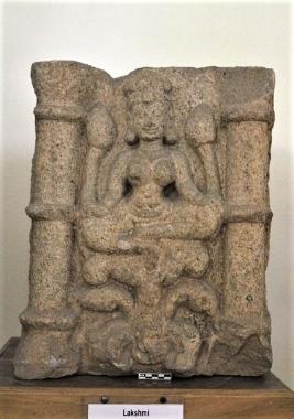 | Description / विवरण | Here the deity Lakshmi is seated on a creeper- decorated pedestal in the lalitasana attitude. Both its hands hold two mirnalas(lotus stalks) with padma. The image is wearing a mukuta and other alamkars. The seated figure of the deity is set within a plastered niche. The eyes, nose and lips are clearly depicted. The right breast is slightly mutilated. Three perforations are noticed on the upper surface. |