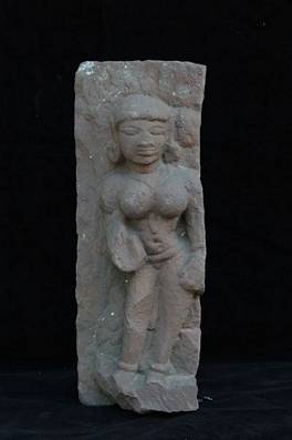 | Description / विवरण | Stone fragment showing a standing female figure with her right hand lowered in abhaya while left placed on her thigh |