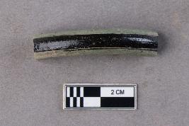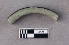 | Description / विवरण | An opaque, semi-circular fragment of a glass bangle. The inner layer is greenish-white, with an added layer of black facing the exterior circumference of the bangle fragment as a decorative element. |