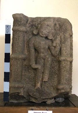 | Description / विवरण | This broken sculpture represents a male figure standing on a partly broken lotus pedestal showing tribhanga posture. The figure is placed under two decorative pillars having carvings of horizontal rings. Facial representations include closed eyes, a broken nose and lips. The right hand of the figure is in katyavalambita pose while the ayudhas of the left hand is not clearly visible as it is partly broken. The figure is adorned with an ornamented mukuta, big circular kundalas and hara (neck ornament). The lower part of the feet is mutilated. |