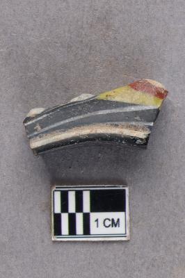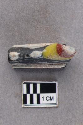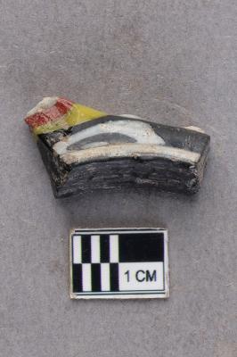| Description / विवरण | A fragment of a glass bangle. There is black and white marbling on it with raised white blobs as decoration on the outer circumference of the bangle fragment. A bigger protruding blob is coloured yellow with red and white in the middle as decoration as well. |