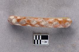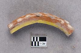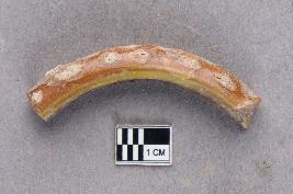 | Description / विवरण | A semi-translucent, smooth glass bangle fragment. The interior is yellow in colour, transitioning into orange with alternating white blobs arranged in three lines on the exterior circumference as decoration. |