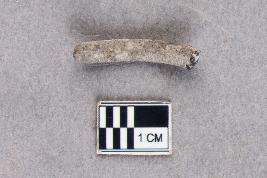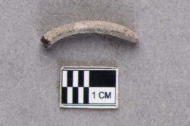 | Description / विवरण | A smooth, semi-circular fragment of a glass bangle with a circular cross-section. It is white in colour with a darker core and is covered in dirt. |