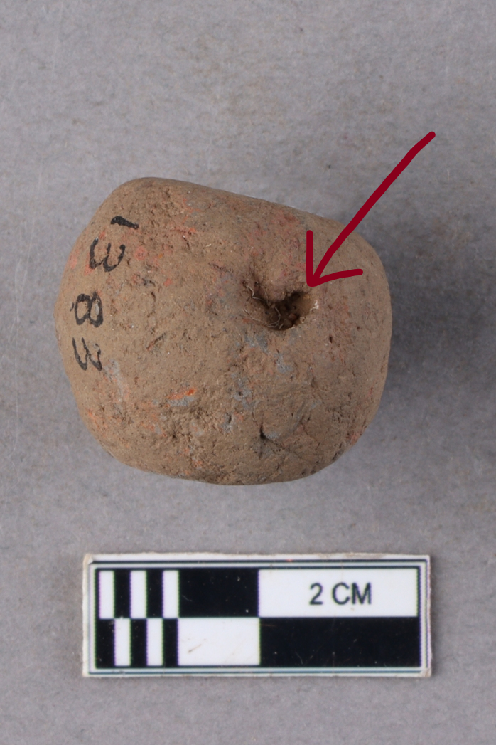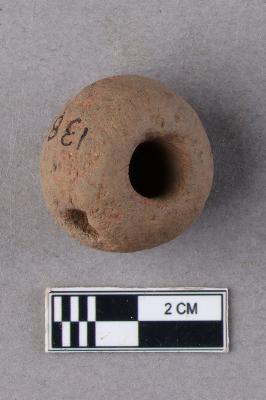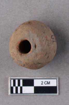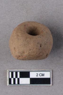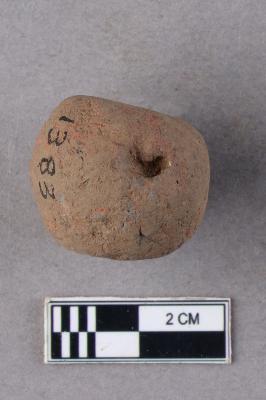 A short barrel-shaped terracotta bead with central perforation. It is red in colour and slightly irregular in shape.