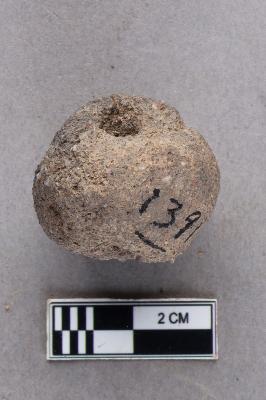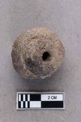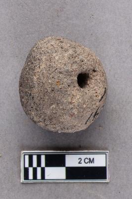 | Description / विवरण | An irregular areca nut terracotta bead with a broken end and central perforation. There is a shallow groove around one perforation. It appears to be grey. |