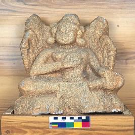 | Description / विवरण | This embellishing sculpture depicts the image of a male figure seen in seated posture with crossed leg position, on top of a pedestal. It is carved under a decorative stele. The right hand is placed near his chest which is slightly mutilated and its left hand is simply kept on the left knee portion, its feet were mutilated. The figure is decked up with a mukuta, big circular kundalas along with karna puspa and haras. Other details are not very clear. |