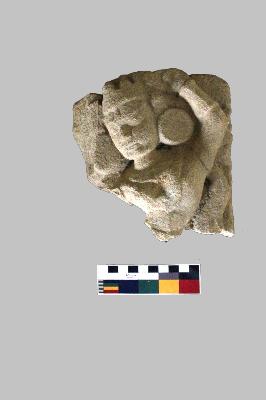 | Description / विवरण | It is a low-relief scultpure carved out of a granite boulder. The salvaged part has the upper body of a male figure found to have a contorted body with his left arm suspended high in the air. It has a square-shaped face with a broad nose and drooping eyes. The image is adorned with ornamentation such as hara (necklace), spherical earrings( Kundala), a spiked headgear; bangles (Kangana) and armlet (Keyura) on left hand, tilak on the forehead. A strand of loose hair is seen to be hanging behind the figure. A portion of stele is still intact. |