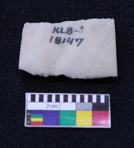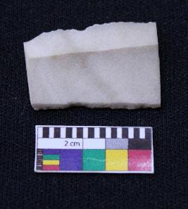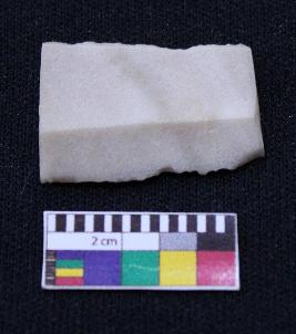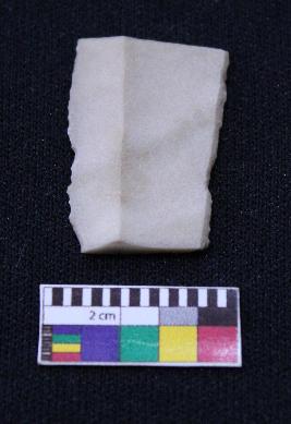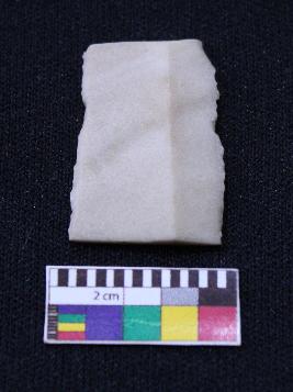 | Description / विवरण | Fragment of blade is off white in color, made of fine-grained stone, having broken ends, smooth body, retouched sides, mid ridge on the top, and triangular section. |