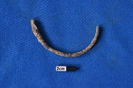 | Description / विवरण | A fragment of copper bangle with a circular cross-section and a patinated surface. |