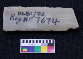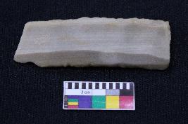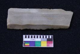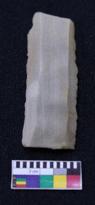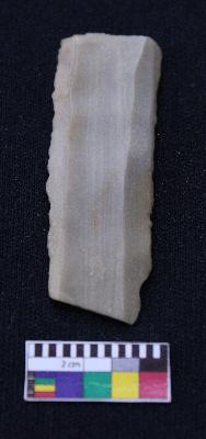 | Description / विवरण | Fragment of blade is made of fine-grained stone, having broken ends, retouched sides, two ridges on the top, and thin section. |