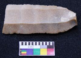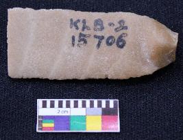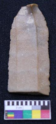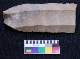 | Description / विवरण | Fragment of blade is brown in color, having positive bulb of percussion at one end and other is broken, retouched sides, two ridges on the top and thin section. |