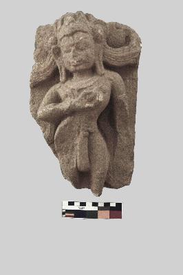 | Description / विवरण | It is a figurine of a male carved on a coarse-grained granite boulder in a low relief. The carvings of the image lack sophistication. The decorative block is partially broken damaging the sculpture where the figurine s feet are entirely missing. The facial features are almost worn out due to extreme weathering however, the eyes, dramatic eyebrows, defined jawline and chin are prominently visible. He is facing to his right. He is adorned with a tilak on his forehead and oval-shaped loops. The figurine is seen to be adorned with a decorated spiked headgear, Kanthabhushana (necklace) covering the entire torso. A coin-shaped beaded ornament is also seen worn by the image. A simple girdle is carved around the waist. The Antariya is dangling in between his thighs. His hair is shown to be waving in the air. His right hand is closer to the chest gesturing Mukula mudra and his left hand is partially broken. The figure is seen to be standing in a Samabhanga posture with the weight of the body shifted entirely on the right leg. Loose ends from his attire is seen waving behind him. |