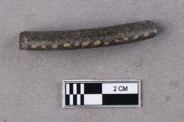 | Description / विवरण | An opaque, smooth glass bangle fragment that is black in colour. The cross-section appears to be triangular and a decorative strip of white dots runs along the outer circumference of the bangle as a decorative element. |