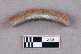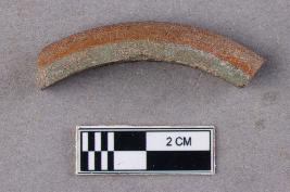 | Description / विवरण | An opaque, smooth, semi-circular, glass bangle fragment with a triangular cross-section. The outer layer is a deep shade of orange while the inner core is whitish green. |
