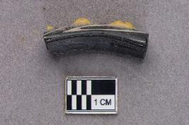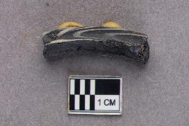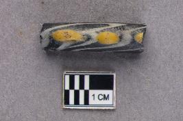 | Description / विवरण | An opaque, smooth glass bangle fragment. There is white marbling on the black fragment along with yellow blobs as decoration on the outer surface. |
