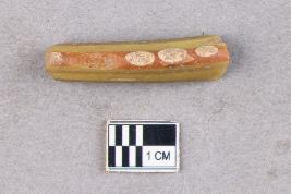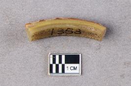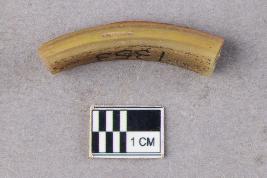 | Description / विवरण | A semi-translucent, smooth, semi-circular glass bangle fragment. The core is yellow while the exterior layers range from deep yellow to orange causing a gradient effect. There is a band of white dots on the orange band as decoration. |