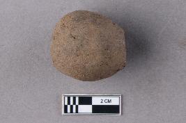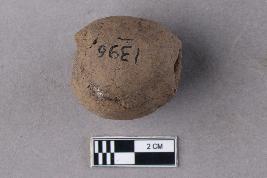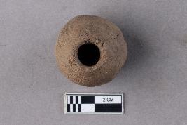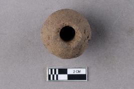 | Description / विवरण | A smooth, irregularly barrel-shaped bead of terracotta with a central perforation. It is reddish in colour. |