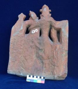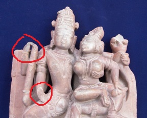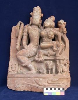 Four armed Siva seated in lalitasana. Two armed Parvati sitting on the left thigh of Shiva. Both deities are wearing mukut, earrings, necklaces, armlets, wristlets and lower garments. Shiva holds a trident (broken) in his back right hand while the attribute in his upper right hand is broken. Shiva holds a snake (Cobra) in one of his left hands while the other one is touching the breasts of Parvati. Two-armed Parvati holds a mirror in her left hand, while her right hand rests on the right shoulder of Shiva. Below the main image figures of seated Ganesha in the left, Nandi in the middle, and Kartikeya on the right are depicted.