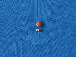| Description / विवरण | A short barrel shaped bead of carnelian in red-orange colour with perforation at the center and a smooth surface. |