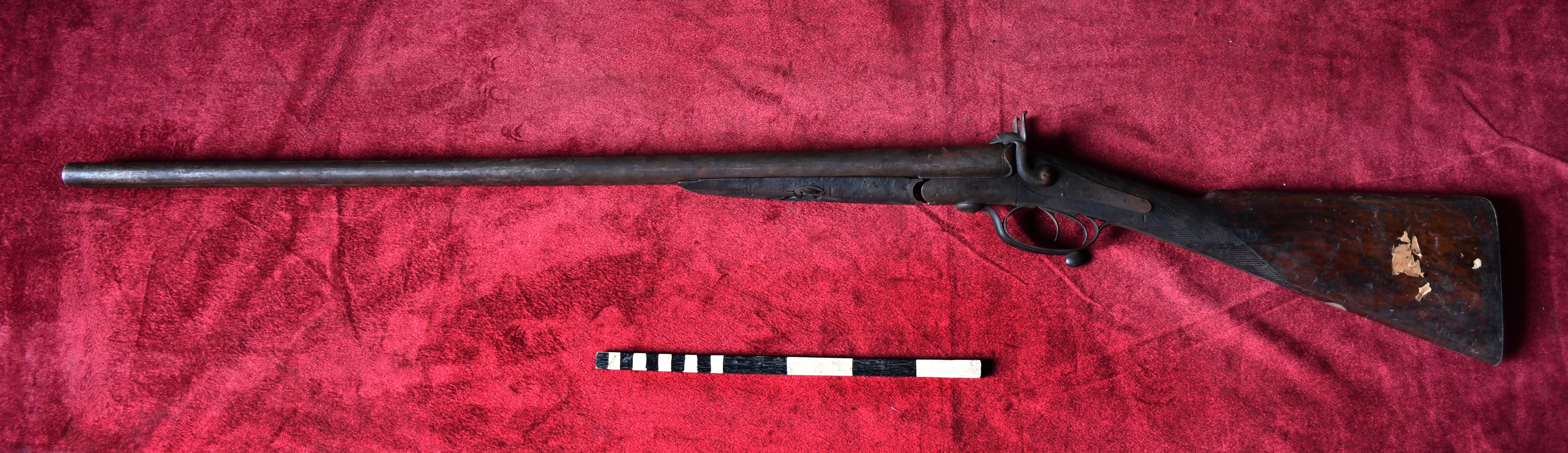 Flint -lock muzzle loading double barreled gun.it is Inscribed Huzuri on oval shaped silver plate. Having butt no. 45 & 2361 HW on the body is written on its body.