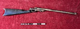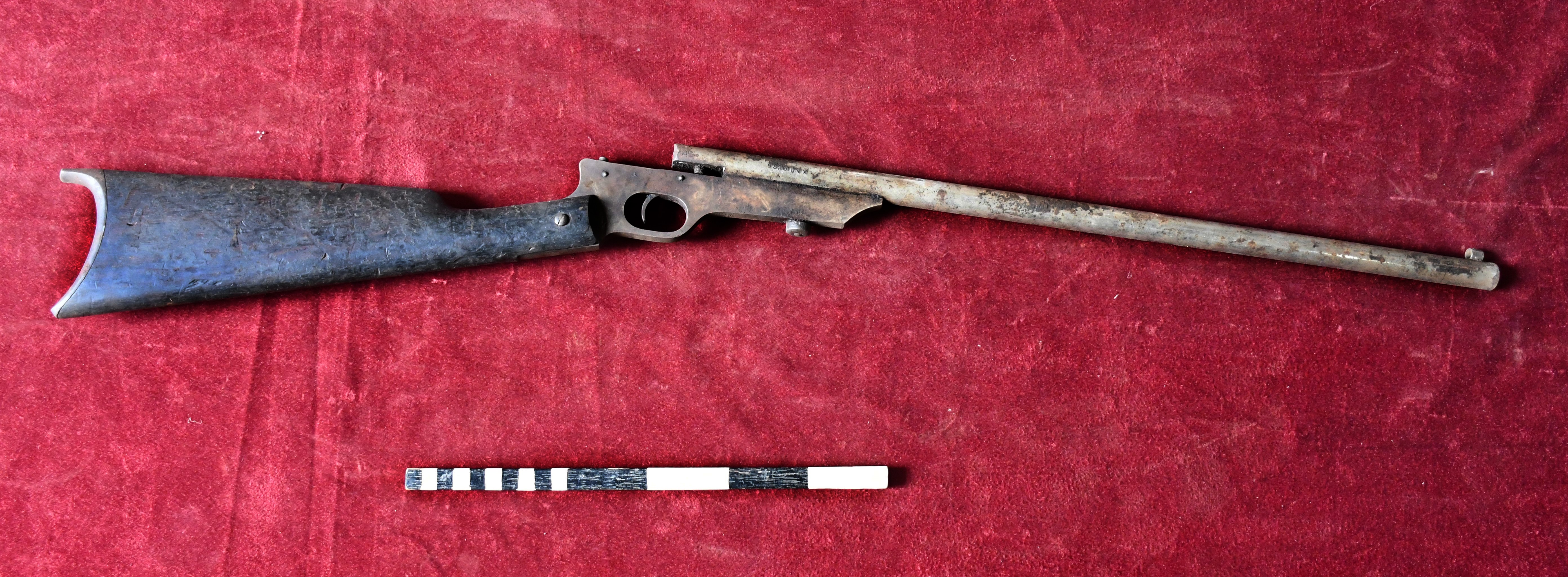 Single barreled Air gun. No. XMDO 875 is written on its body. This is a gun having one barrel and an air gun is a gun that fires projectiles using energy from compressed air or other gases that are mechanically pressurized.