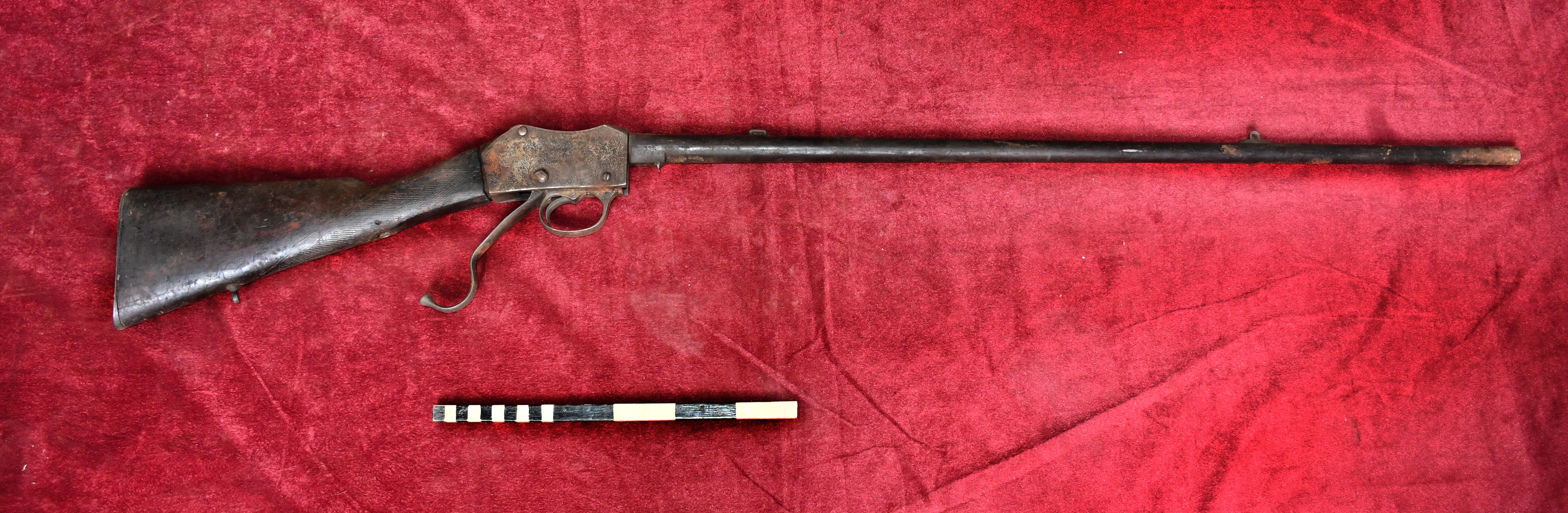 Breech loading single barreled gun. Having XMDO no. 887 on it s body. This is a gun having one barrel and this breech-loader is a firearm in which the user loads the ammunition (cartridge or shell) via the rear (breech) end of its barrel, as opposed to a muzzleloader, which loads ammunition via the front (muzzle).