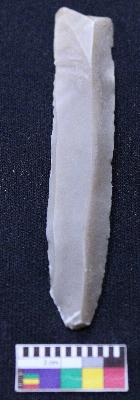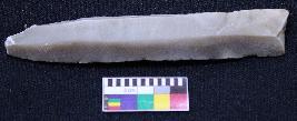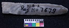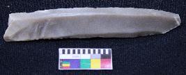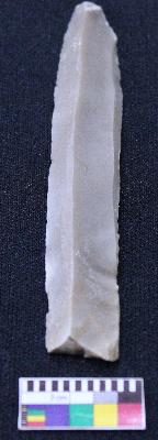 | Description / विवरण | Fragment of blade is grey in color, having one end broken, retouched sides, mid ridge on the top, triangular section and bands are present. |