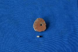 | Description / विवरण | A terracotta spindle whorl with unfinished corners and a hole in the middle. The fabric used is red slipped ware and there is a worn out mark which indicates it was used as a spindle. |