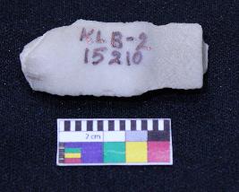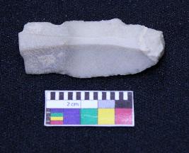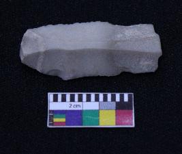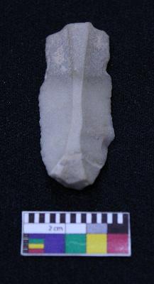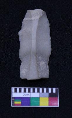| Description / विवरण | Fragment of blade is off white in color, having positive bulb of percussion at one end, other end is broken ends, both sides are retouched, ridges on the top and triangular section. |