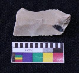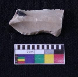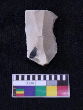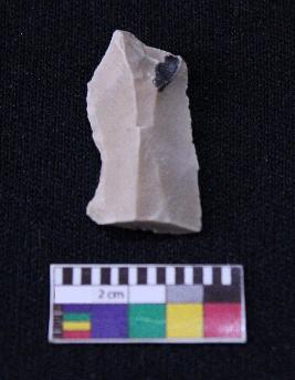 | Description / विवरण | Fragment of blade is off white in color, having positive bulb of percussion at one end, other end is broken, both sides are retouched, mid ridge on the top and triangular section. |