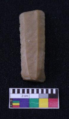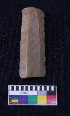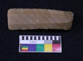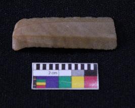 | Description / विवरण | Fragment of blade is brownish in color, having one end broken, retouched sides, ridges on the top, thin section and traces of bands on it. |