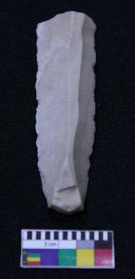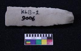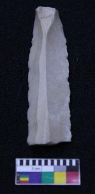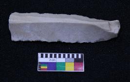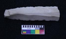 | Description / विवरण | Fragment of blade is white in color, having positive bulb of percussion at one end, other end is broken, retouched sides, mid ridge on the top and triangular section. |